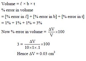 The length, breadth and thickness of a strip are : (10.0 ± 0.1) cm, (1.00 ± 0.01) cm and (0.100 ± 0.001) cm respectively. The most probable error in its volume will be :