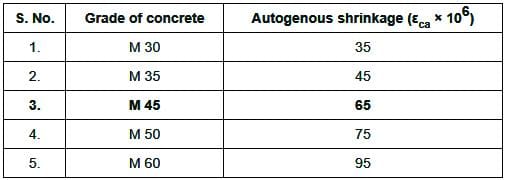 For M-45 concrete as per IS : 1343 - 2012, in prestressed concrete structures, which is the correct value for autogenous shrinkage (εca x 10-6)?
