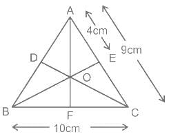In the given triangle, O is the incentre, AE = 4 cm, AC = 9 cm and BC = 10 cm. What is the length of side AB?