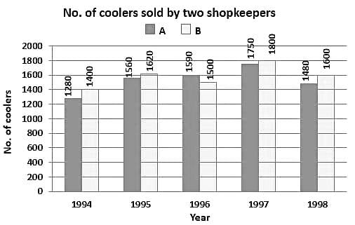 The following bar graph shows the number of coolers sold by shopkeepers A and B in different years. Study the graph and answer the question that follows.
