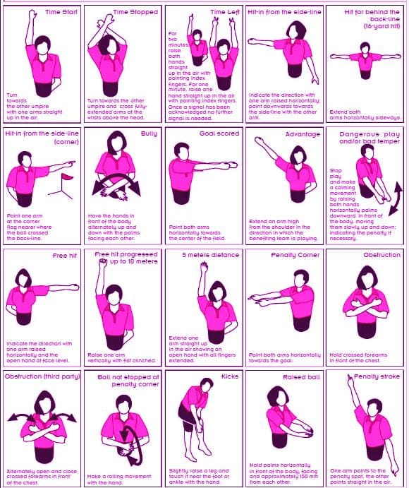 हॉकी में, यदि अंपायर दोनों भुजाओं को क्षैतिज रूप से मैदान के केंद्र की ओर इंगित करके संकेत करता है, तो इसका क्या अर्थ है?