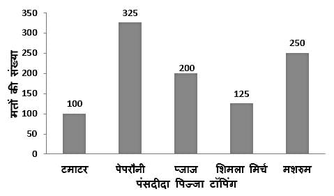 निम्नलिखित दंड आलेख पिज्जा पर पसंदीदा टॉपिंग के लिए मतों की संख्या दर्शाता है।