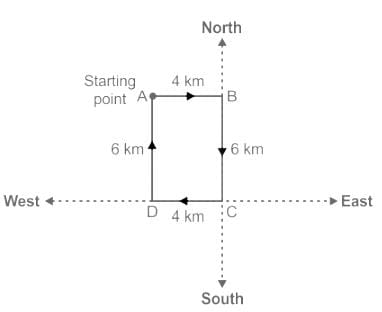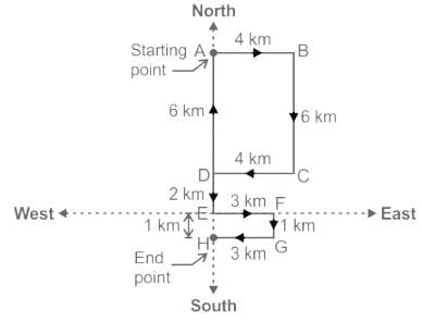एक आदमी 4 किमी पूर्व की ओर चलता है; दाएँ मुड़ता है और 6 किमी चलता है और फिर दाएँ मुड़ता है और 4 किमी चलता है। फिर वह दाएँ मुड़ता है और 6 किमी चलता है; फिर दक्षिण की ओर 8 किमी मुड़ता है; बाएँ मुड़ता है और 3 किमी चलता है फिर से दाएँ मुड़ता है और 1 किमी चलता है; फिर अंत में दाएँ मुड़ता है और 3 किमी चलता है । वह प्रारंभिक बिंदु से कितनी दूर है?