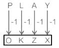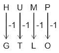एक निश्चित कूट भाषा में, 'HUMP' को 'GTLO' के रूप में लिखा जाता है और 'LIKE' को 'KHJD' के रूप में लिखा जाता है। उस भाषा में 'PLAY' को कैसे लिखा जाएगा?