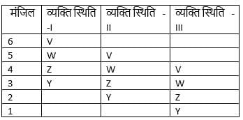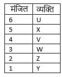 U, V, W, X, Y और Z एक ही इमारत के विभिन्न मंजिलों पर रहते हैं। इमारत में सबसे निचली मंजिल की संख्या 1 है, इसके ऊपर की मंजिल की संख्या 2 है, और इसी तरह सबसे ऊपर की मंजिल की संख्या 6 है। Z, Y के ठीक ऊपर वाली मंजिल पर रहता है। U और V के बीच केवल एक व्यक्ति रहता है। W, Z के ठीक ऊपर और V के ठीक नीचे रहता है। दूसरी मंजिल पर कौन रहता है?