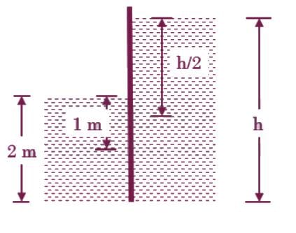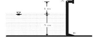 A rectangular plate measuring 6 m in height and 5 m in width obstructs the end of a fresh water channel that is 5 m deep, as illustrated in the figure. The plate is pivoted around a horizontal axis at its upper edge at point A and is prevented from opening by a fixed ridge located at point B.