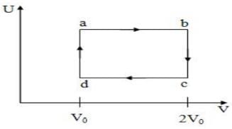 The illustration below depicts how the internal energy U varies with the volume V of 2.0 mol of an ideal gas during a cyclic process labeled abcda. The temperatures of the gas at points b and c are 500 K and 300 K, respectively. Calculate the amount of heat absorbed by the gas (in Joules) throughout the cyclic process abcda.