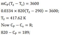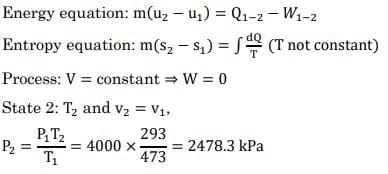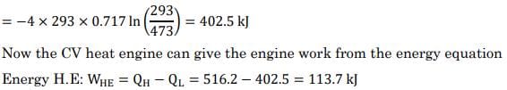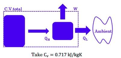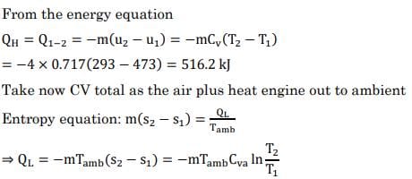 A rigid container holds 4 kg of air (considered as an ideal gas) at a temperature of 200°C and a pressure of 4 MPa. This serves as the hot energy source for a heat engine, which operates with its cold side at 20°C before coming to a halt. The energy output of the heat engine is _________ kj.