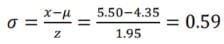 A person flying over a particular continent is exposed to cosmic radiation, which is represented as a normal random variable with a mean of 4.35 units. Determine the standard deviation such that the probability of exposure during the flight being at least 5.50 units is 0.0256, given that the cumulative distribution function value at 1.95 is 0.4744.