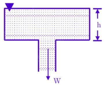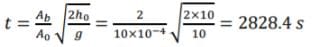 , where h represents the height of water above the opening as depicted in the figure. Suppose the area of the hole is Ao = 10 cm2 and the bottom area of the cylindrical tank is Ab = 2 m2. What is the time in seconds required to drain the tank from an initial depth of ho = 10 m? Take g = 10 m/s2.