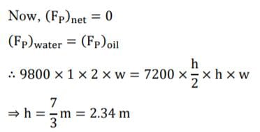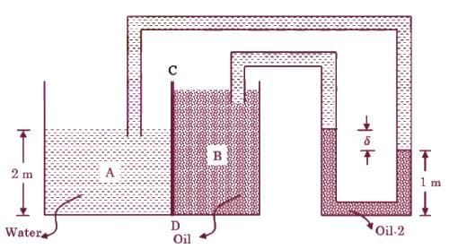 A rectangular tank is divided into two sections, A and B, which hold water (yw = 9.8 kN/m3) and oil (Yoil = 7.2 kN/m3), respectively, as illustrated in the figure. A differential manometer filled with another type of oil (Yoil2 = - 12 kN/m3) is also present. If the total pressure force acting on wall CD is zero, then the deflection δ is ___________ mm.