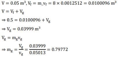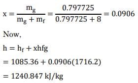 At 250°C, hf = 1085.36 kJ/kg, hfg = 1716.2 kJ/kg, Vf = 0.0012512 m3/kg, vg = 0.05013 m3/kg