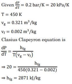 The change in saturation pressure with respect to saturation for a liquid is 0.2 bar/K at a temperature of 450 K. The specific volumes of dry saturated vapor and saturated liquid at 450 K are 0.321 m3/kg and 0.002 m3/kg, respectively. Utilizing the Clausius Clapeyron equation, the latent heat of vaporization is _____________ kJ/kg.