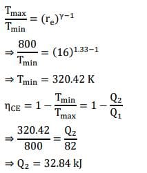 A Carnot engine operates with a blend of gases as its working fluid, characterized by γ = 1.33. The heat input is 82 kJ, and the adiabatic expansion ratio is 16:1. The temperature of the heat source is 800 K. What is the quantity of heat expelled to the sink in kJ? (Round your answer to two decimal places)