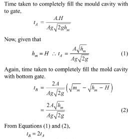 In a sand casting operation, the total liquid head is maintained constant such that it is equal to the mould height. The time taken to fill the mould with a top gate is tA. If the same mould is filled with a bottom gate, then the time taken is tB. Ignore the time required to fill the runner and frictional effects. Assume atmospheric pressure at the top molten metal surfaces. The relation between tA and tB is