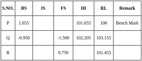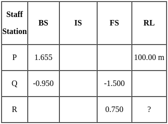 A leveling is carried out to establish the Reduced Levels (RL) of point R with respect to the Bench Mark (BM) at P. The staff readings taken are given below.