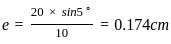 An offset is laid out 5° from its true direction on the field. Find the resulting displacement of the plotted point on the paper in a direction parallel to the chain line on the paper if the length of offset is 20 m and the scale is 10 m to 1 cm. (Cos 5° = 0.996, Sin 5° = 0.087)