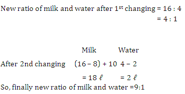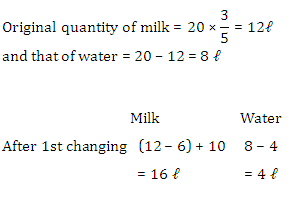 A 20 litres mixture contains milk and water in the respective ratio of 3: 2. Then 10 litres of the mixture is removed and replaced with pure milk and the operation is repeated once more. At the end of the two removals and replacements, what is the ratio of milk and water in the resultant mixture respectively?