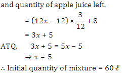 In a vessel, there is a mixture of apple, orange and mango juices in the ratio of 3: 5: 4 respectively. A quantity of 12 litres from the mixture is replaced by 8 litres of apple juice. Thereafter the quantities of apple and orange juices in the resultant mixture become same. Find out the initial quantity of mixture in the vessel.