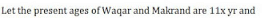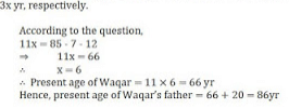वकार और मकरंद की वर्तनाम आयु का अनुपात 11:3 है| वकार रहीम से 12 वर्ष छोटा है|7 वर्ष बाद रहीम की आयु 85 वर्ष होगी| वकार के पिता जो वकार से 20 वर्ष बड़े हैं, की वर्तमान आयु क्या है?