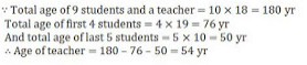 9 छात्र और उनकी अध्यापक की औसत आयु 18 वर्ष है| पहले चार छात्रों की औसतन आयु 19 वर्ष और अंतिम पांच की औसतन आयु 10 वर्ष है| अध्यापक की आयु क्या है?