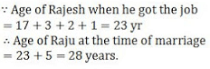 राजेश ने नौकरी मिलने के 5 वर्ष बाद शादी का निर्णय किया| जब उसने 12 कक्षा उत्तीर्ण की तब वह 17 वर्ष का था| 12वीं कक्षा के बाद, उसने 3 वर्ष का स्नातक पाठ्यक्रम पूरा किया और 2 वर्ष स्नात्तोकोतर पाठ्यक्रम किया| स्नात्तोकोतर पाठ्यक्रम पूरा करने के ठीक 1 वर्ष बाद उसे नौकरी मिल गयी| उसकी शादी कितनी आयु पर होगी?