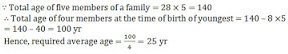 एक परिवान के पांच सदस्यों की औसतन आयु 28 है| यदि सबसे छोटे सदस्य की वर्तमान आयु 8 वर्ष है तो सबसे छोटे सदस्य के जन्म के समय परिवार की आयु का औसत क्या होगा?