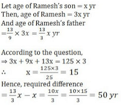 रमेश की वर्तमान आयु उसकी पुत्र से तीन गुनी और उसकी पिता की वर्तमान आयु की 9/13 है| उन तीनों की वर्तमान आयु का योग 25 वर्ष है| उसके पुत्र और पिता की वर्तमान आयु के बीच का अंतर क्या है?