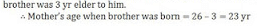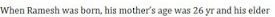रमेश का भाई उससे 3 वर्ष बड़ा है| उसके पिता उसकी बहन के जन्म पर 28 वर्ष के थे जबकि उसकी मां उसके जन्म पर 26 वर्ष की थीं|यदि उसकी बहन उसके भाई के जन्म के समय चार वर्ष की थी तो रमेश की मां उसके भाई के जन्म के समय कितने वर्ष की थीं?