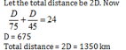 एक व्यक्ति 24 घंटे में कुछ दूरी तय करता है| वह रेल से 75 किमी/घंटा की दर से आधी दूरी और कार से 45 किमी/घंटा की शेष दूरी तय करता है| उसके द्वारा तय की गयी कुल दूरी क्या है?