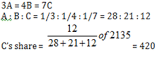 2135 रुपए को A, B और C में कुछ इस प्रकार विभाजित किया जाए कि A का हिस्सा 3 गुणा, B का हिस्सा 4 गुणा और C का हिस्सा 7 गुणा करने पर सभी आपस में बराबर हो जाते हैं| C का हिस्सा क्या है?