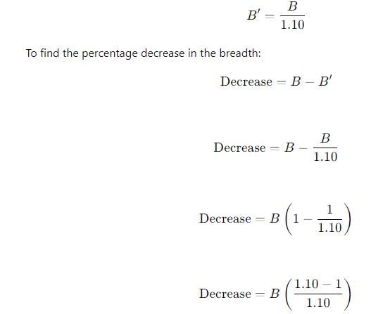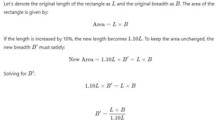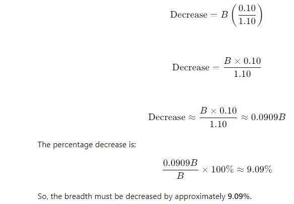 If the length of a rectangle is increased by 10% and area is unchanged then the corresponding breadth must be decreased by–