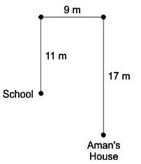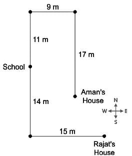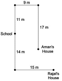 Rajat also starts from the same School, walks 14 m towards the south, then takes a left turn and walks 15 m before stopping at his house.
