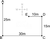 Point E is 10 m west of point D.