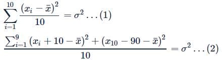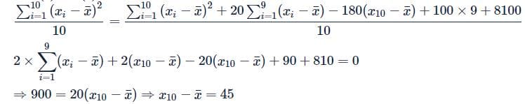 The mean and standard deviation of 10 observations x₁, x₂, x₃, ... x₁₀ are x̄ and σ respectively. Let 10 be added to x₁, x₂, ... x₉ and 90 be subtracted from x₁₀. If the standard deviation remains the same, then x₁₀ - x̄ is equal to:
