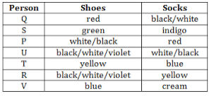 (i) P, Q, R, S, T, U and V are seven persons wearing a shoes of different colours - white, red, black, green, yellow, blue and violet - and socks of different colours - blue, red, white, black, cream, yellow and indigo. The persons, colour of the shoes and colour of the socks above are not necessarily in the same order. No person is wearing shoes and socks of same colour.