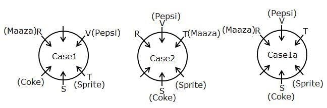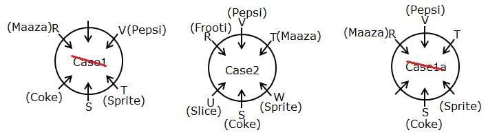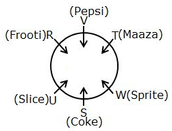 Only one person sits between S and the one who drinks Maaza. R sits second to the left of S who does not drink Slice. The one who drinks Sprite sits opposite to R. The one who drinks Coke sits third to the right of the one who drinks Pepsi. T sits immediate left of V who faces the one who drinks Coke. U does not drink Sprite but sits to the immediate right of the one who drinks Frooti. W does not sit adjacent to the one who drinks Frooti.