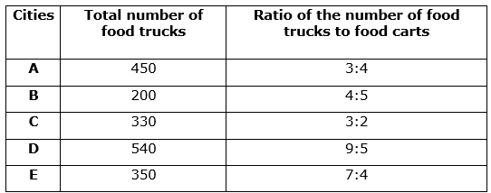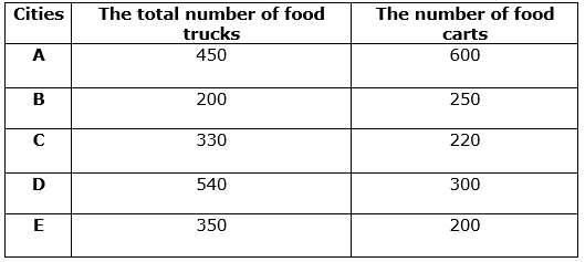 The given table chart shows the total number of food trucks in five different cities i.e. A, B, C, D and E in 2000 and also given the ratio of the total number of food trucks to food carts in these five different cities in 2000.