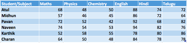 Direction: The following table provides the information on the marks scored by six students in six subjects.