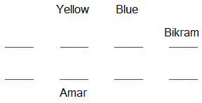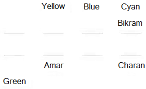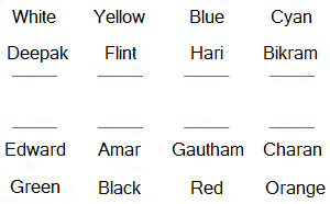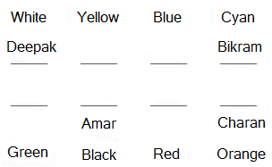 Amar sits behind the person who likes yellow. The person who likes blue is sitting to the left of Bikram and he is the only neighbour of Bikram. Amar and Bikram are not sitting in the same row. The person who likes yellow is sitting adjacent to the person who likes blue. Amar is sitting adjacent to the person who likes green. The person who likes green is not sitting behind the person who likes blue. Charan is sitting behind the person who likes cyan. Charan does not like green. The persons who like red and orange are sitting adjacent to each other. None of them is a neighbour of the person who likes green. Charan does not like red. Deepak likes white. Flint is sitting adjacent to the person who likes blue. Edward does not like red but he is a neighbour of Amar. Gautham does not like blue.