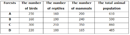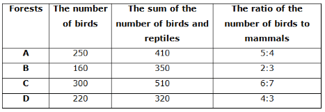 The given table chart shows the number of birds in four different forests i.e. A, B, C and D and also given the sum of the number of birds and reptiles in four different forests and the ratio of the number of birds to mammals in four different forests.