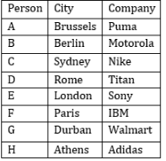 Eight friends A, B, C, D, E, F, G and H work in different companies, viz Puma, Nike, IBM, Adidas, Sony, Titan, Walmart and Motorola. They belong to different cities, viz London, Paris, Sydney, Athens, Brussels, Durban, Rome and Berlin, but not necessarily in the same order.