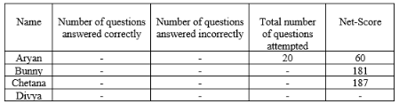 Directions for questions : A test paper contains 50 questions. 4 marks are awarded for every correct answer and one mark is deducted for every wrong answer. Aryan, Bunny, Chetana and Divya appeared for this test and their scores are given in the following table. Further it is also known that Divya has scored the maximum marks. Complete the following table and answer the questions that follow.