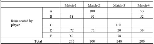 Directions for questions: A team of 5 players A, B, C, D and E participated in a tournament and played four matches (1 to 4). The following table gives partial information about their individual scores and the total runs scored by the team in each match.