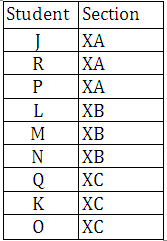 Nine friends, J, K, L, M, N, O, P, Q and R study in a school in class X. They are divided into three sections XA, XB and XC. Only three students will be studying in each section.