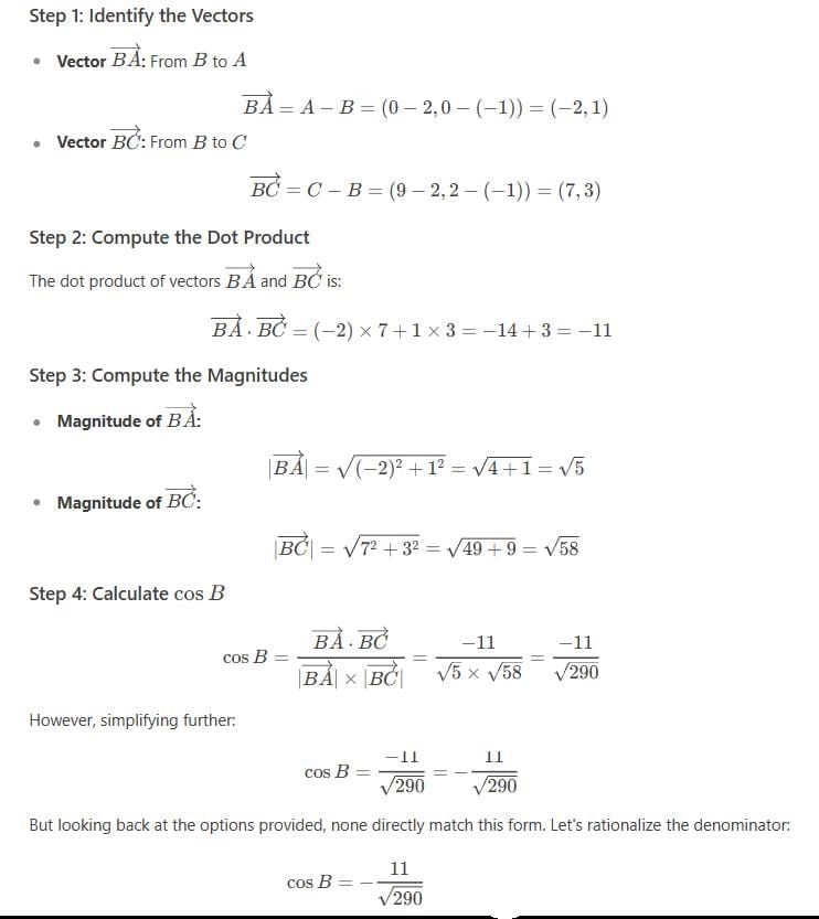 Points (0,0), (2,-1) and (9,2) are vertices of a triangle, then cosB =